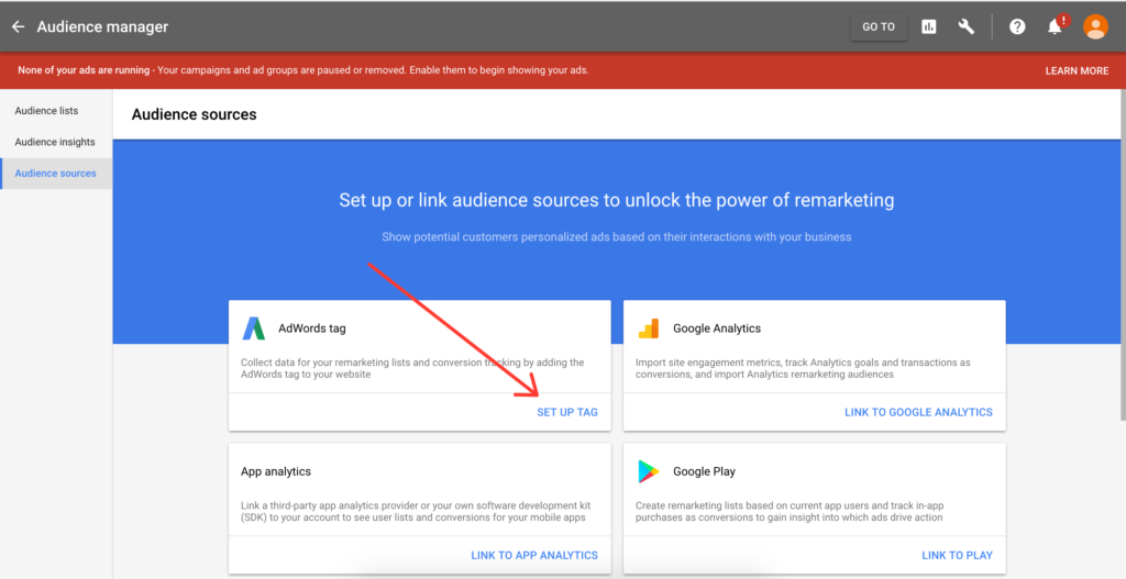 7. Go to your PixelMe dashboard, and navigate to the Audience Builder. Under the ‘Settings’ tab, you can add your Google Adwords pixel! ✨