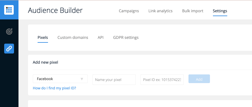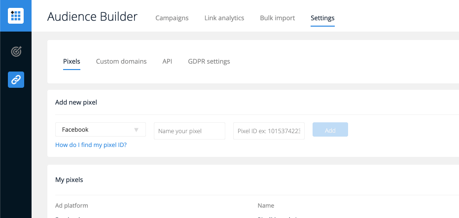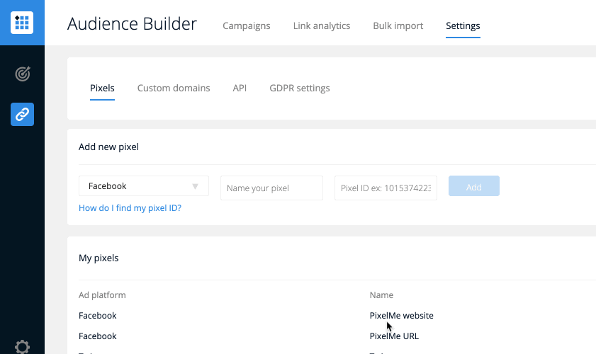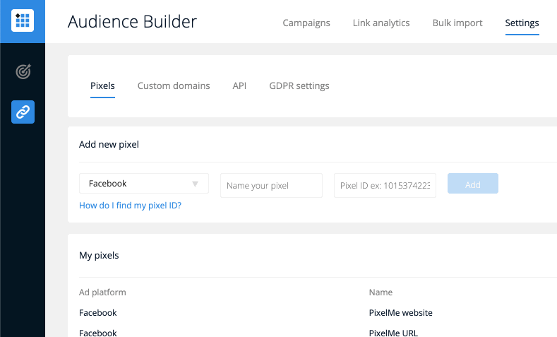You can add your retargeting Pixels ID in the settings tab of your PixelMe account. Select the platform, choose a name so you can select it easily later and copy paste your Pixel ID in the dedicated text field.