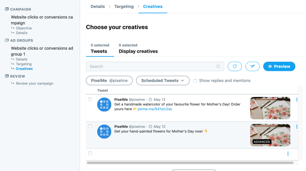 Set up your campaign how you’d like to have it, it’s going to be different per ad. When you get to choosing the ‘Creatives’ portion, you should have the option to select the Tweet you just created (depending on if you scheduled it or Tweeted it, it will either be under “Promoted-only” or “Scheduled Tweets”). Select your Tweet, launch the ad, and you’re done!