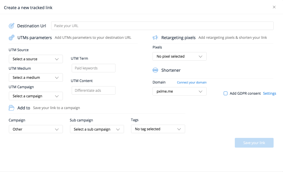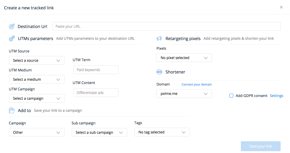 In the top right corner, select the ‘Create a redirect’ button. Add your destination URL, edit your UTM settings as required, and don’t forget to add it to a folder to make it easier to find later. Now, select the pixel(s) you’d like to have in your link. If you have a custom domain set up, you can select that as well.