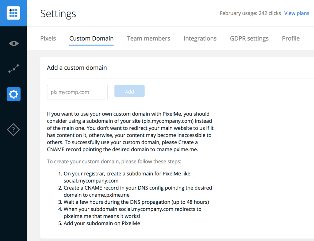 Go to the ‘Settings’ tab on your PixelMe account, then click the ‘Custom Domain’ tab.