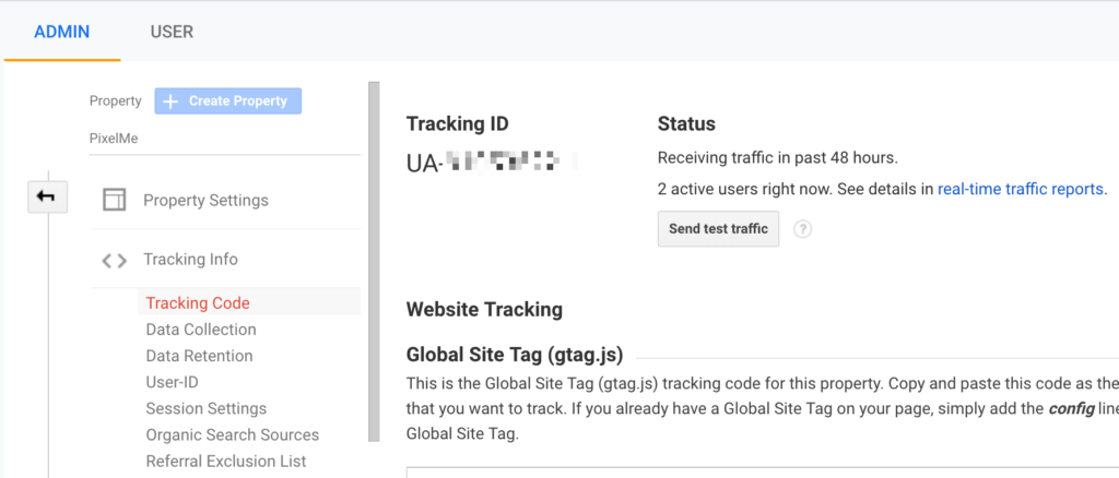 - Under PROPERTY, click Tracking Info > Tracking Code. Your tracking ID is displayed at the top of the page.
