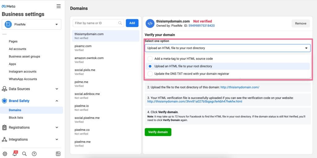 6/ Verify your domain with the second option “Upload an HTML file to your root directory”.