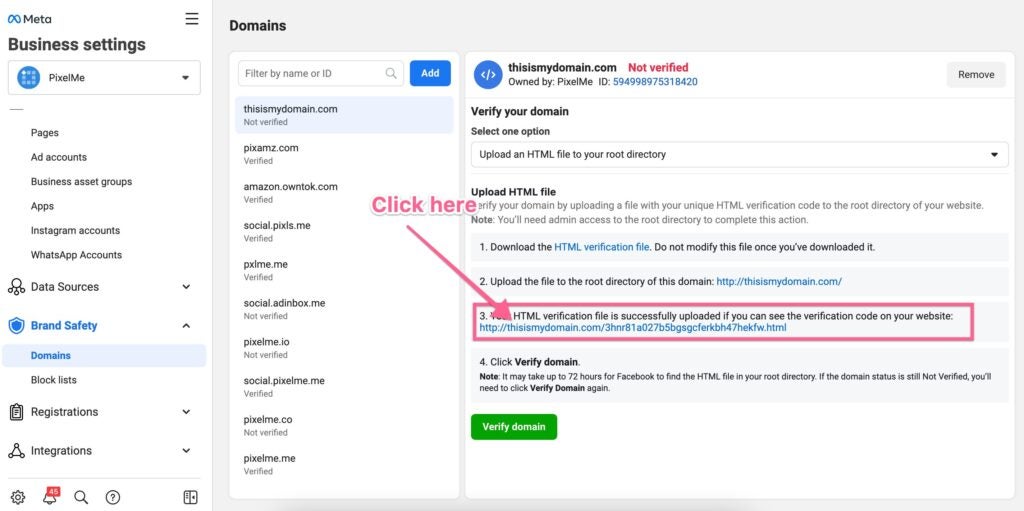 You should first add your custom domain on PixelMe before verifying on Facebook.