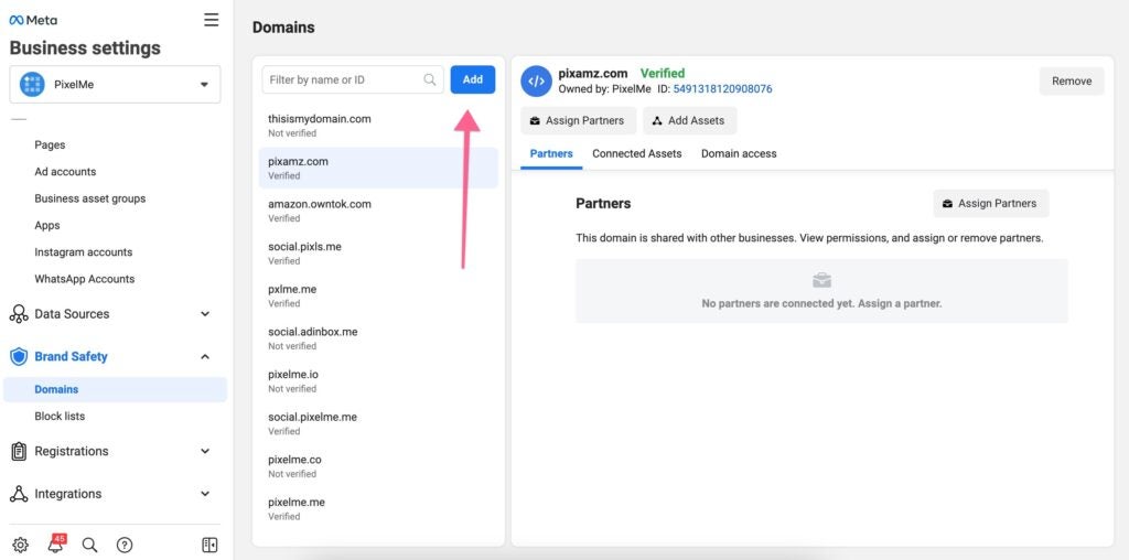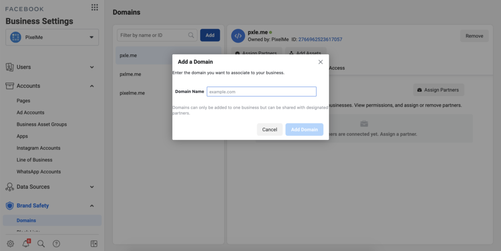 1/ First you can go on the Facebook Business Manager: https://business.facebook.com/settings/owned-domains