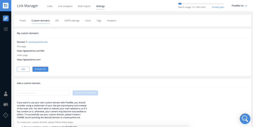 Be careful: in order to fully work, the redirect can take anywhere from 24 to 48 hours. When the redirect is pointing to pixelme.me, add your branded domain in your PixelMe ‘Settings’ tab under ‘Custom domain’. Now, you’re ready to shorten your links with you own domain! 💥